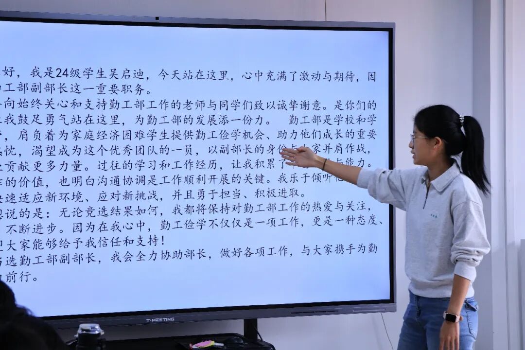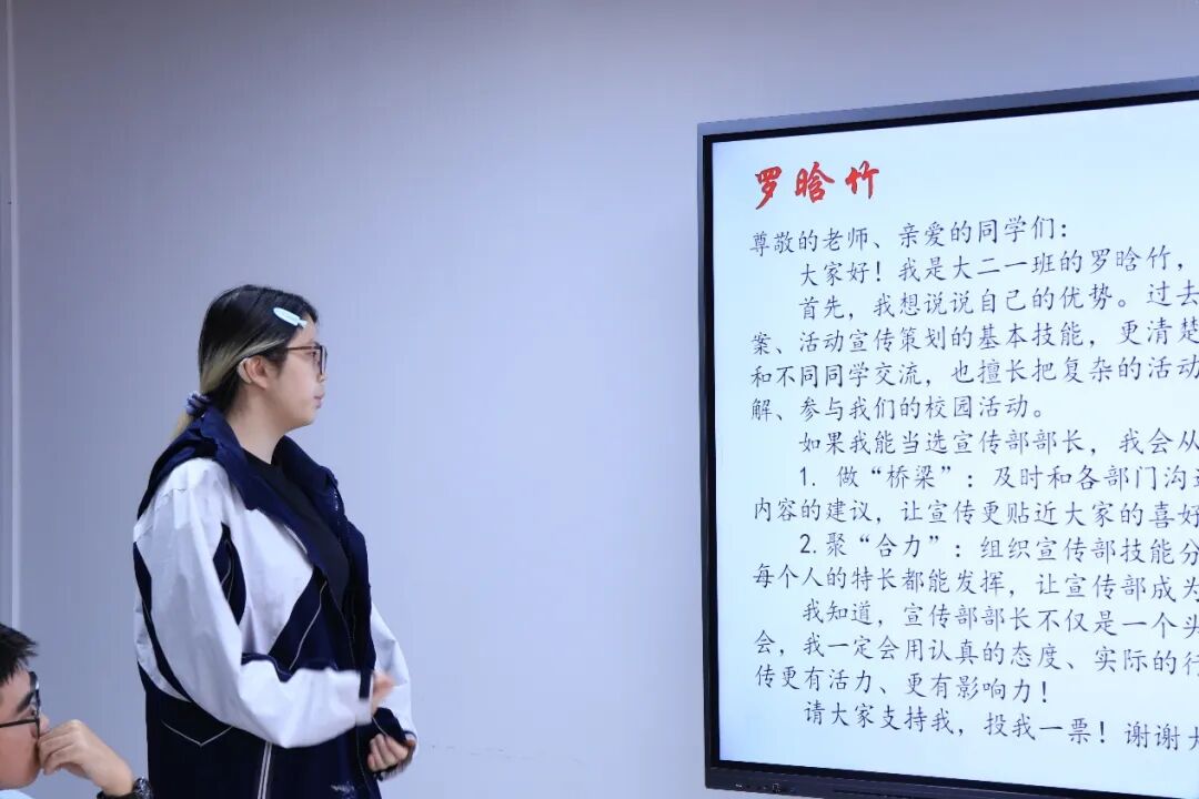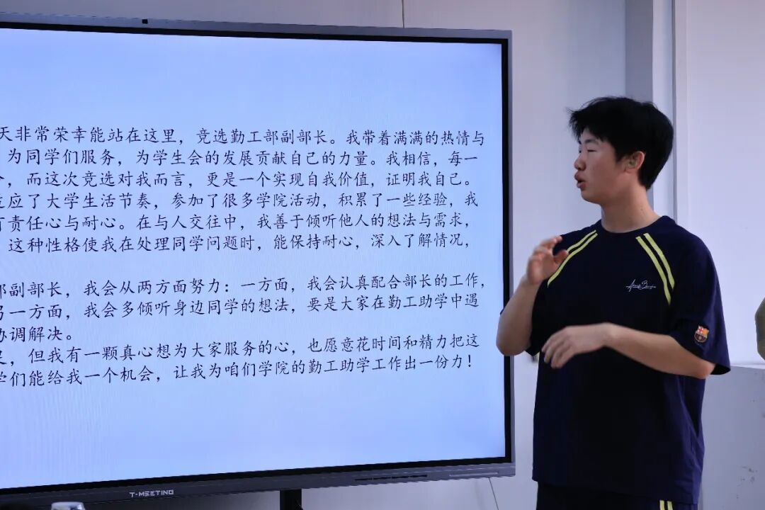 会议中,上届学生干部代表对各部门在过去一年里做出的成绩与不足进行了简要的总结,并提出一些改进建议。随后,竞选人依次登台,向大家展开了各自的竞选演讲。他们凭着一腔热血和满怀信心,从自己的特长、经验和专业角度出发,向台下的老师和同学们倾情阐述自己的工作规划与未来展望。
