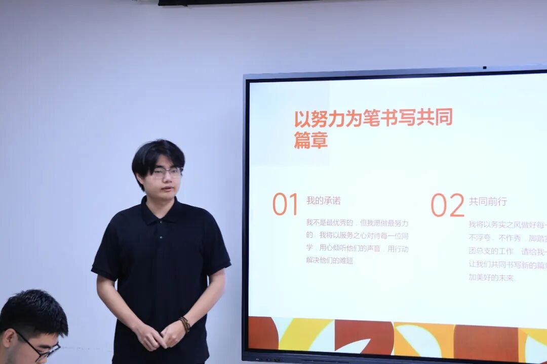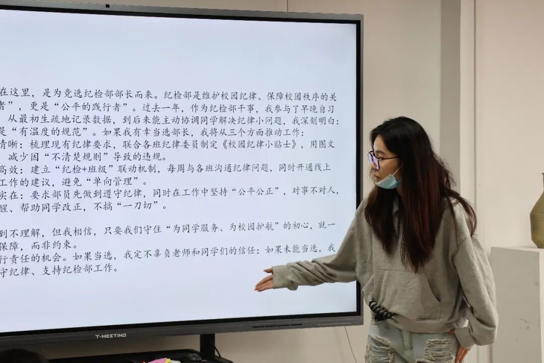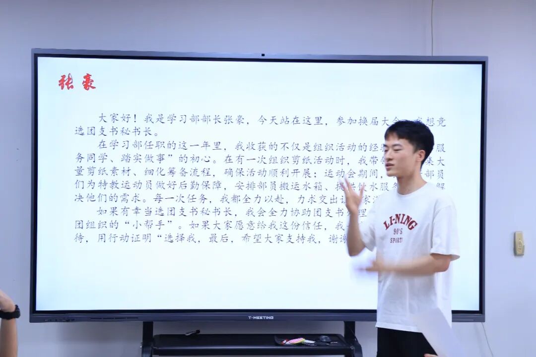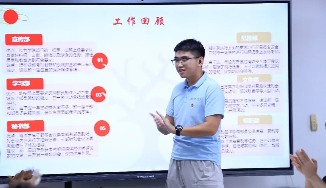 辅导员对过去一学年的学生工作进行了全面的复盘与系统的梳理总结,鼓励大家勇于锻炼自我、不断超越自我,始终坚守“服务学校、服务同学”的宗旨,为学院的高质量发展持续贡献青春力量。同时,辅导员激励竞选新一届学生干部的同学们在实践中锤炼本领、突破自我,将团总支和学生会的服务宗旨落到实处,以实际行动为学院建设添砖加瓦。