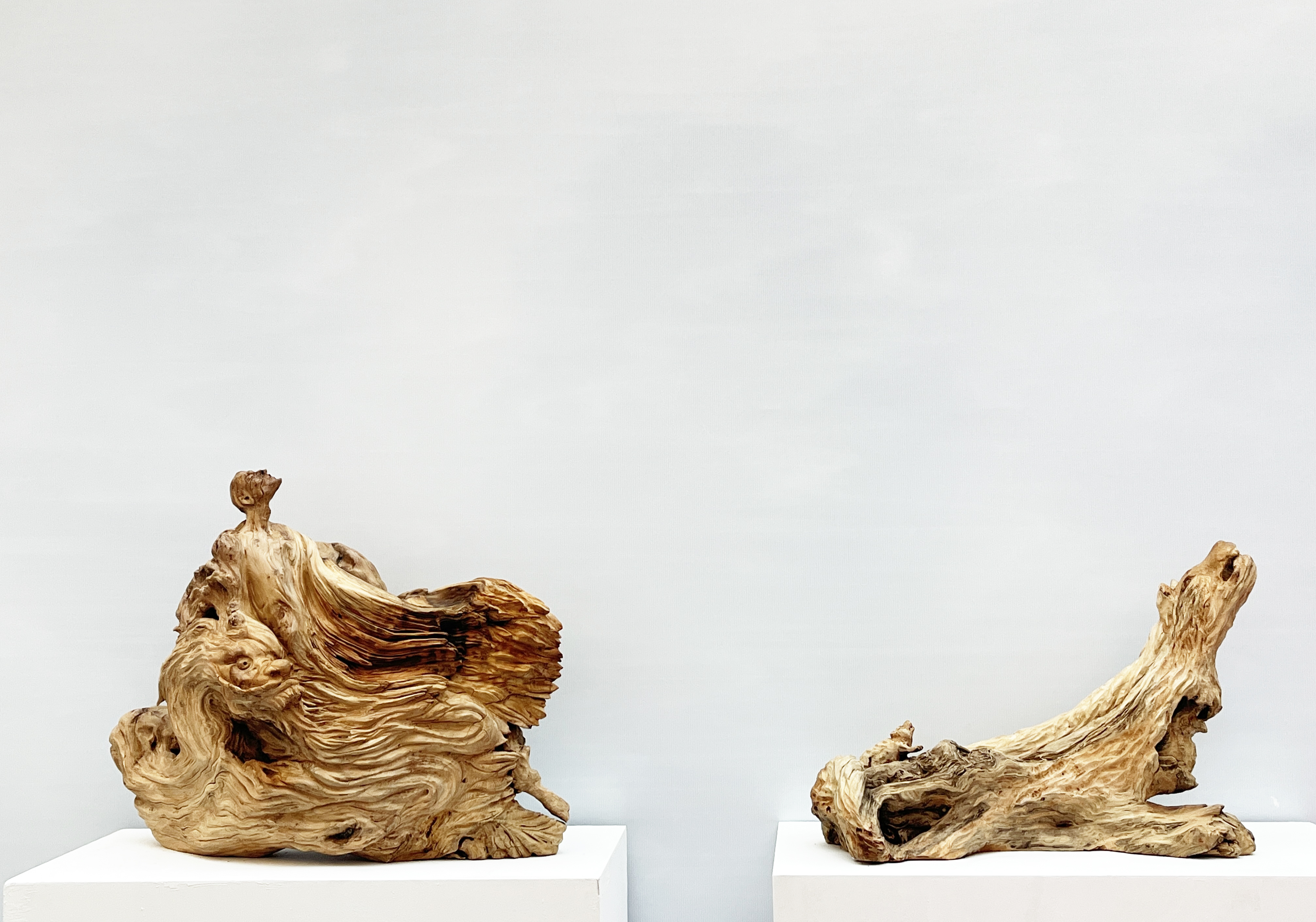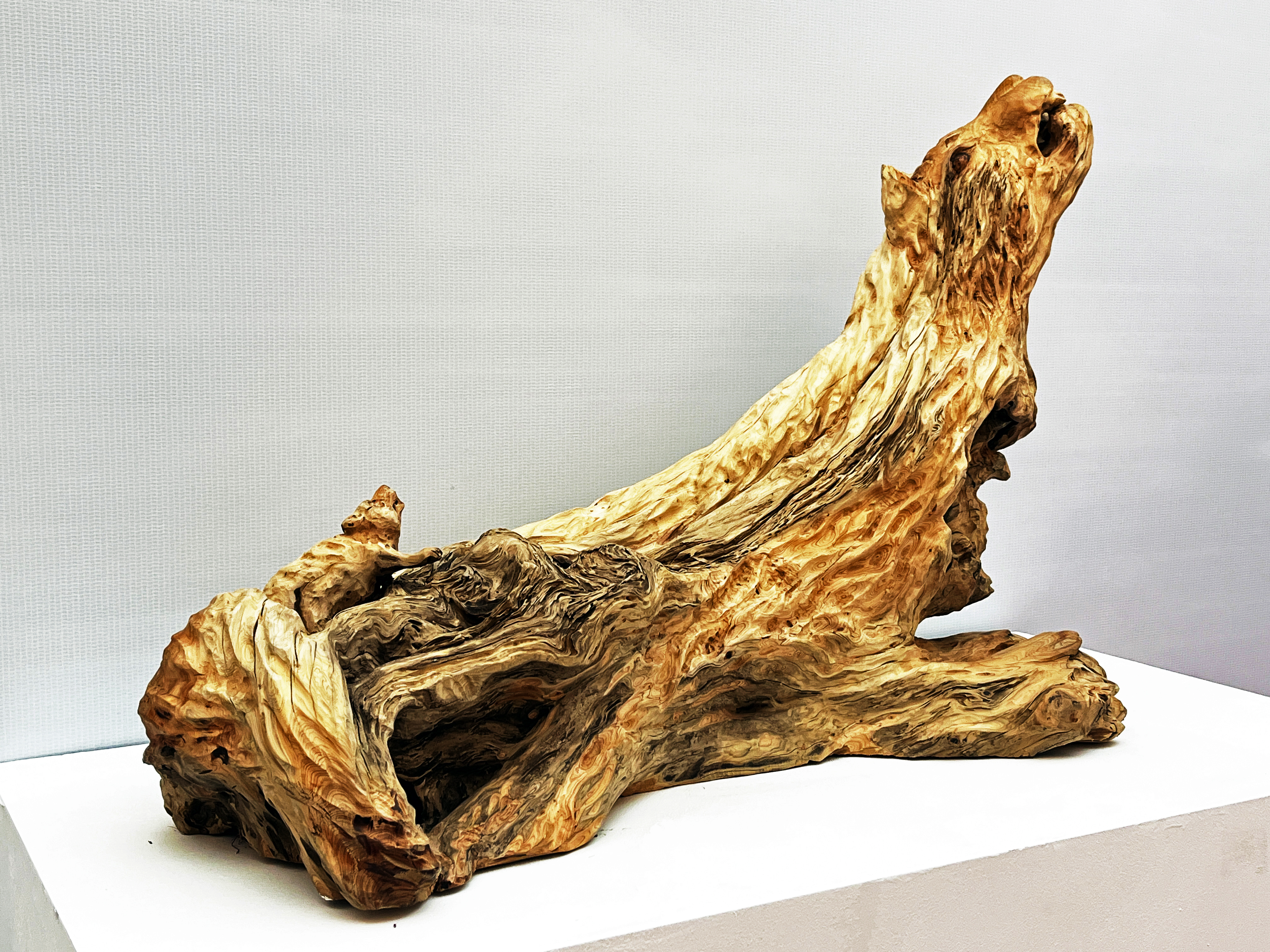 崖柏自身的创伤肌理却成为其精神图腾,龙虎意象在天然木材中若隐若现,木雕技法中的刀痕预示着那些苦难的记忆,暗示着精神困境中的自我救赎。作品拒绝将治愈浪漫化,而是让材料的创伤史与创作过程共同构成一部沉默的自传。