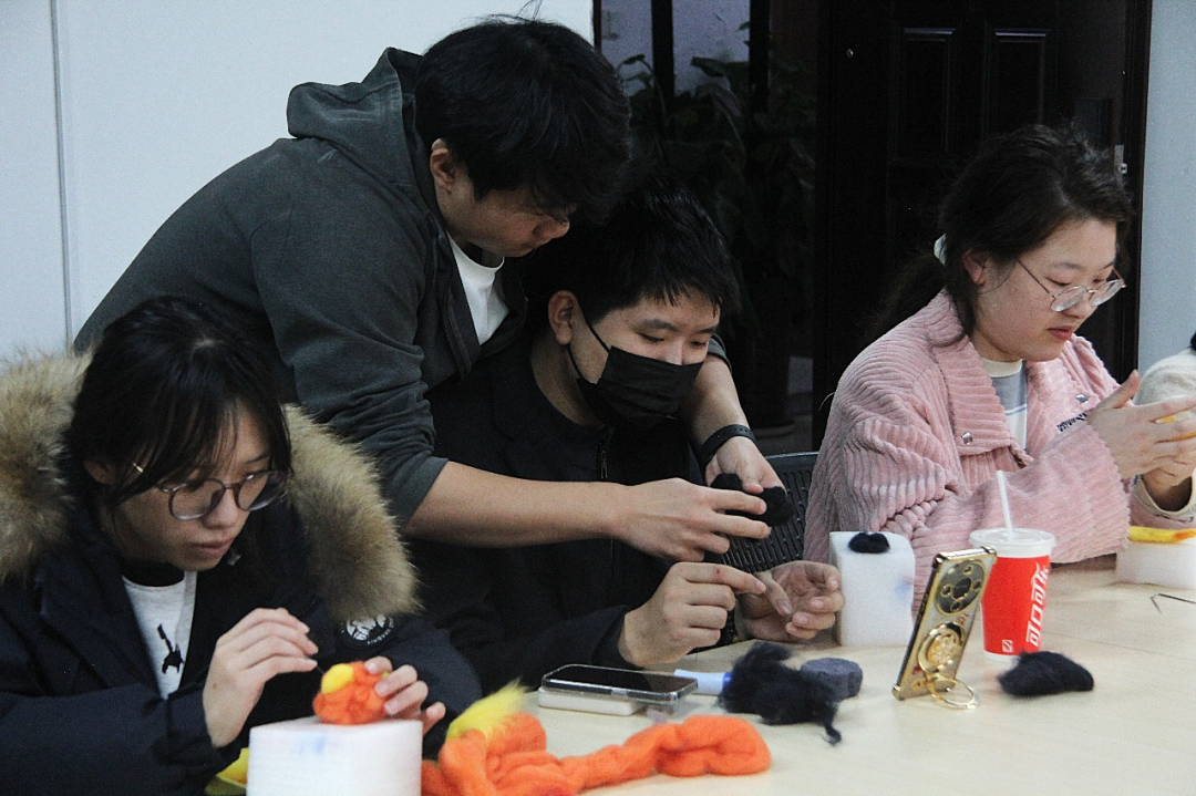 活动伊始,学长学姐们通过简洁易懂的讲解与生动直观的现场示范,向同学们细致介绍了羊毛戳戳乐的工具使用方法及安全注意事项。在耐心指导下,同学们纷纷拿起柔软的羊毛与戳针,全身心投入创作。从初次接触时的生疏试探,到逐渐找到节奏后的从容专注,大家将心中的喜爱与对未来的期待,一点点融进蓬松的羊毛中,凝聚成一个个造型小巧、充满心意的羊毛毡作品。创作间隙,同学们交流技巧、欣赏彼此的成果,现场氛围温馨而融洽。